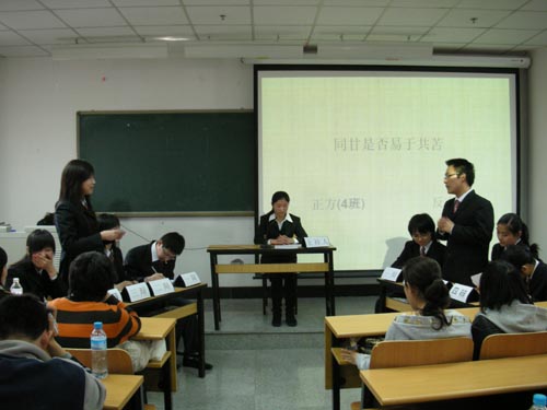3 月25日下午,由合作学院学生会学习部主办的“ TUC-FIU 首届中文辩论赛”前三场比赛在国际教育中心 E-305 成功举办。辩论赛特意邀请了威客电竞辩论社社长卞治达以及领队高仓健担任首轮比赛的评委。首轮比赛分为三场,辩题分别为 “ 对金钱的追求与道德是否可以并行 ” 、 “ 同甘是否易于共苦 ” 、 “ 对大学生应该进行宽松式管理还是封闭式管理 ” ,辩论双方同学使出各路绝招,口唇之争异常激烈。场上辩手精彩的唇枪舌战赢来场下观众的阵阵掌声,评委也对辩手们的优异表现连连称赞。